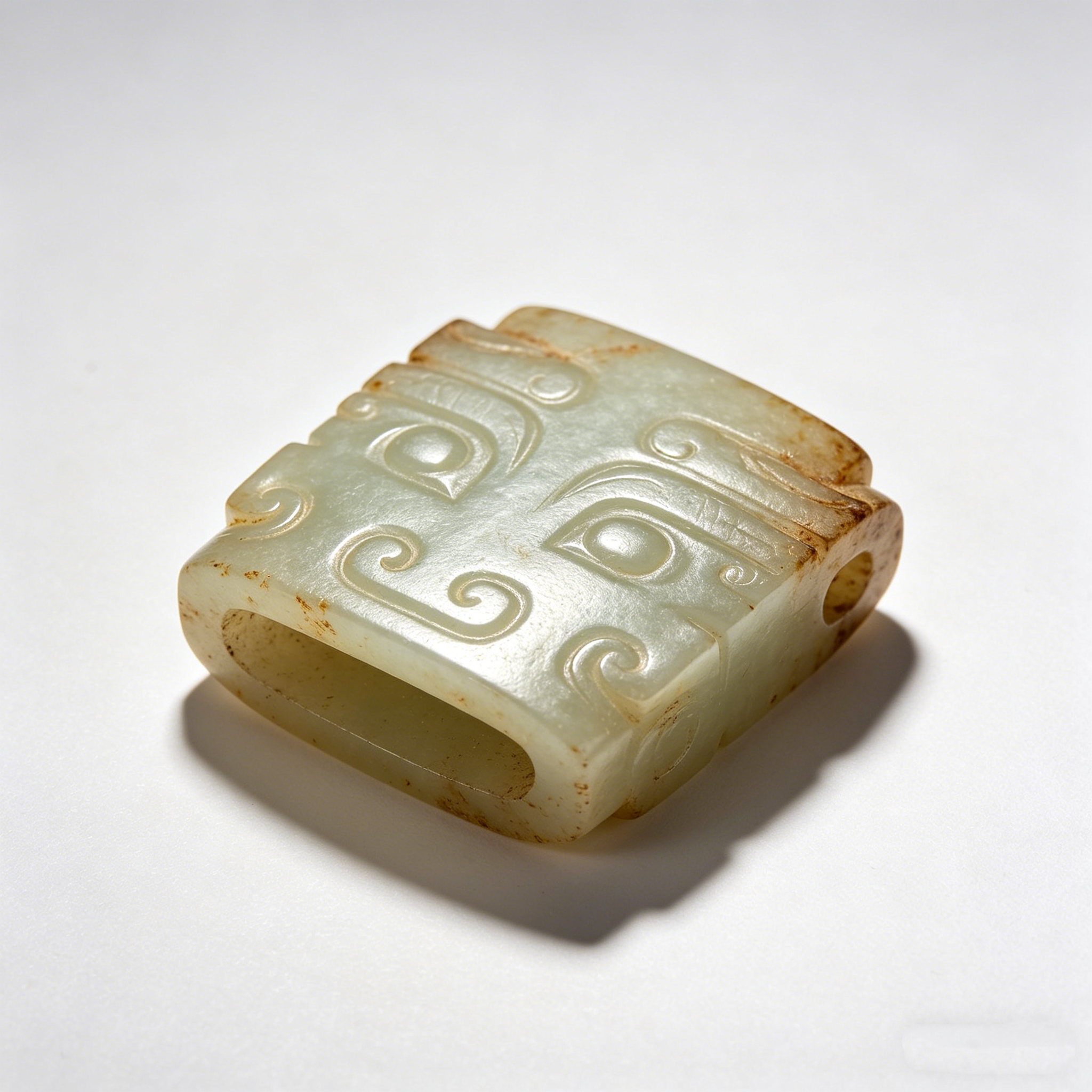 Chinese Archaistic Carved Celadon Jade Taotie Mask Ornament/Belt Slide